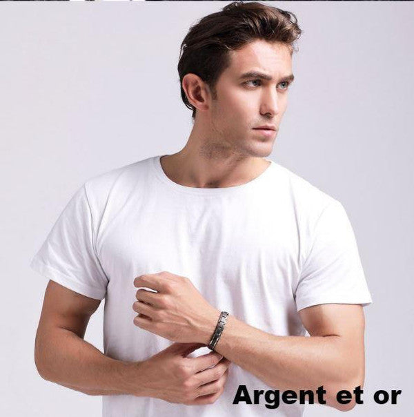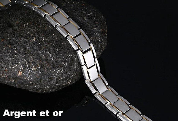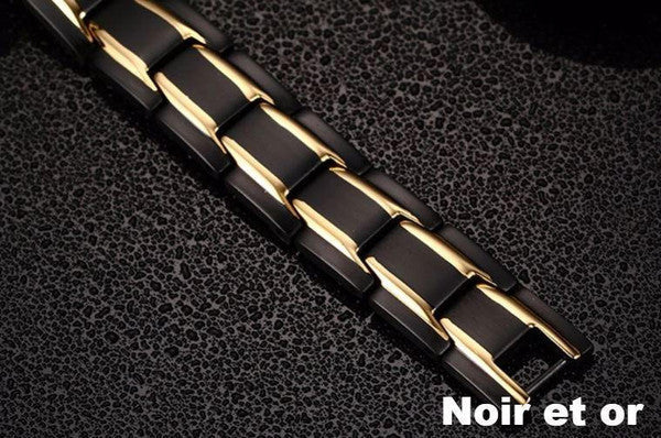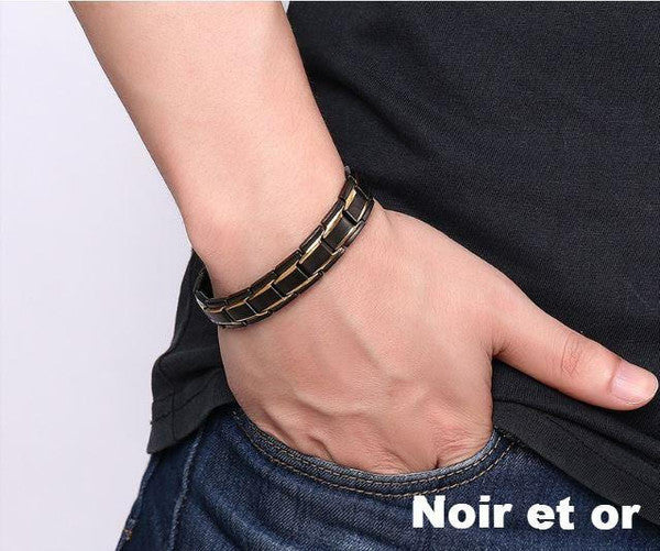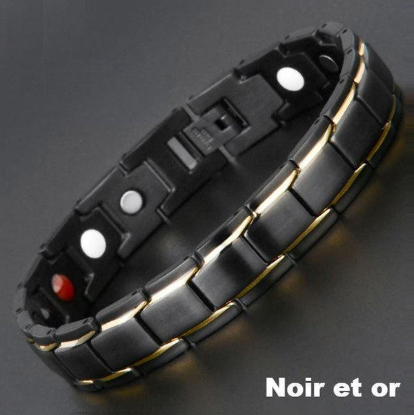"Bracelet magnétique élégant en noir et argent, avec pierres ocre, offrant équilibre énergétique et bienfaits thérapeutiques.