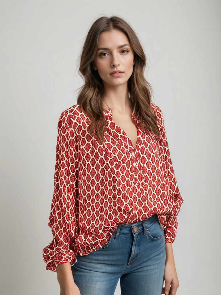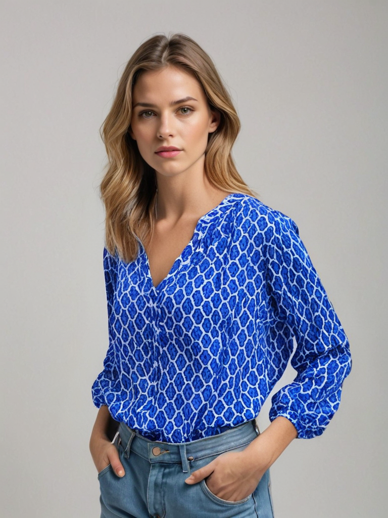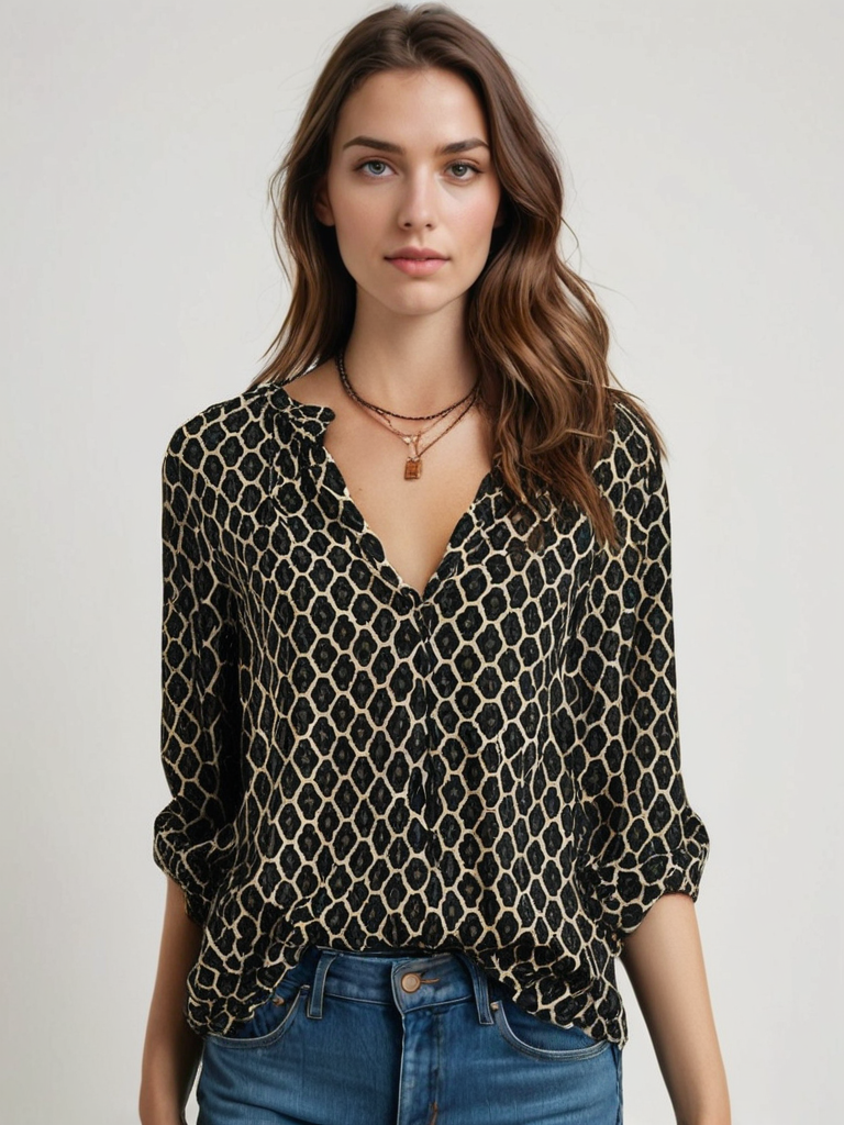 - Dopracowane detale – Długie rękawy z guzikami i wyrafinowanym geometrycznym wzorem.