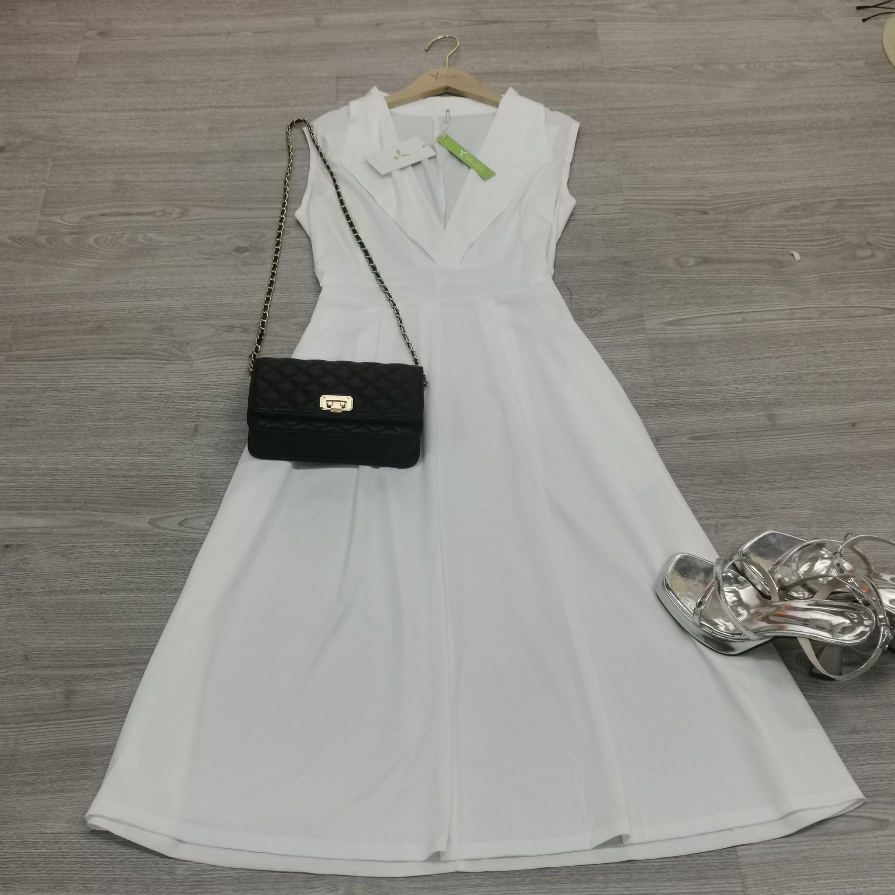 - Projekt: Biała sukienka maxi z dekoltem w szpic i zwiewną sylwetką.